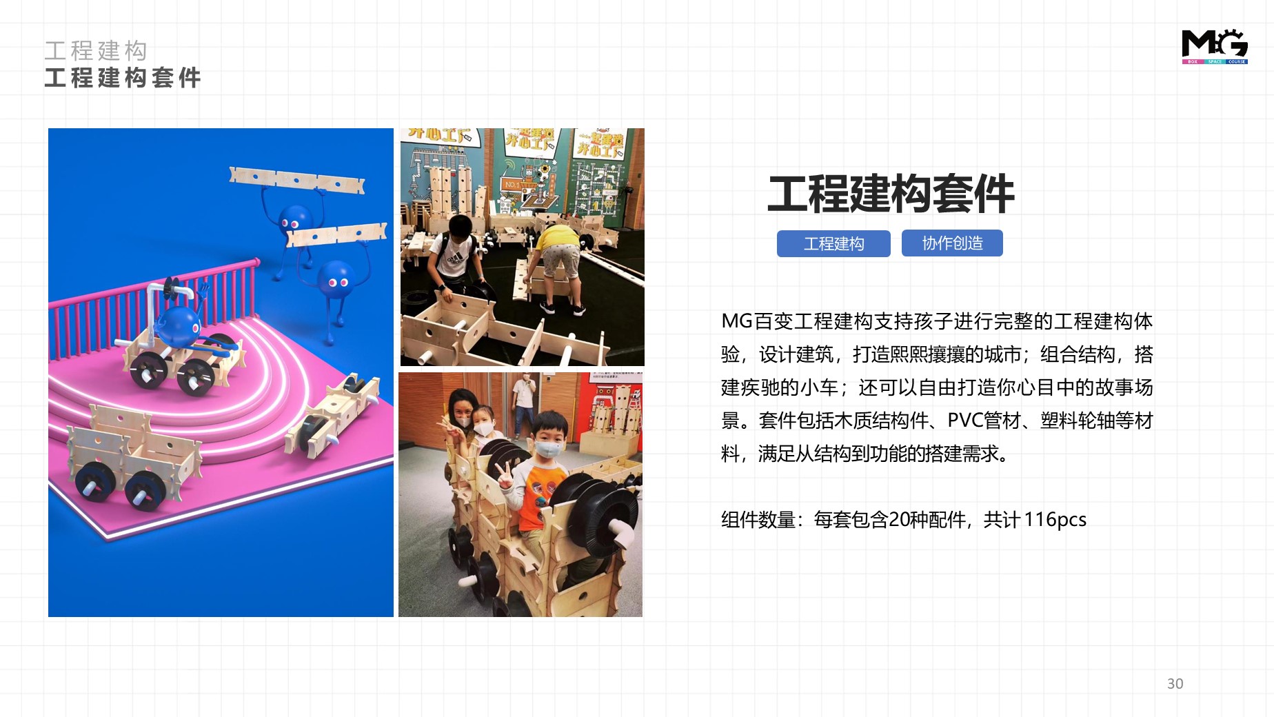 MG百变工程建构支持孩子进行完整的工程建构体验,设计建筑,打造熙熙攘攘的城市;组合结构,搭建疾驰的小车;还可以自由打造你心目中的故事场景。