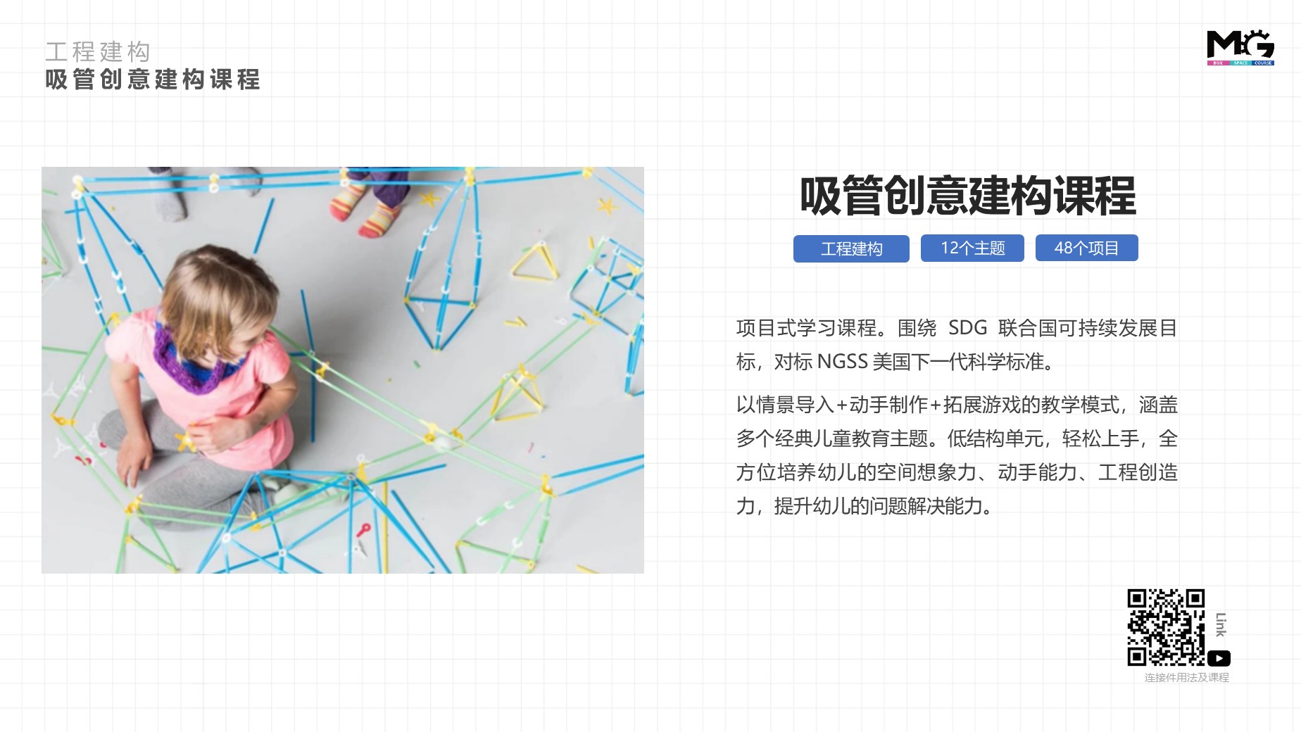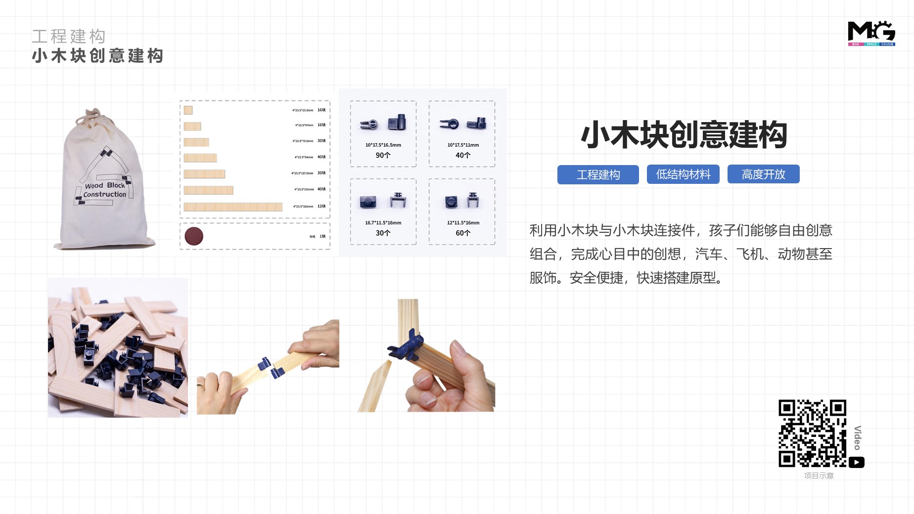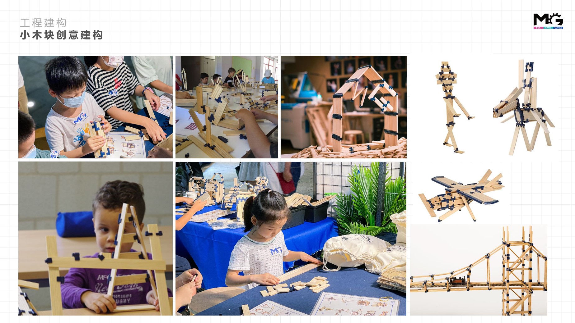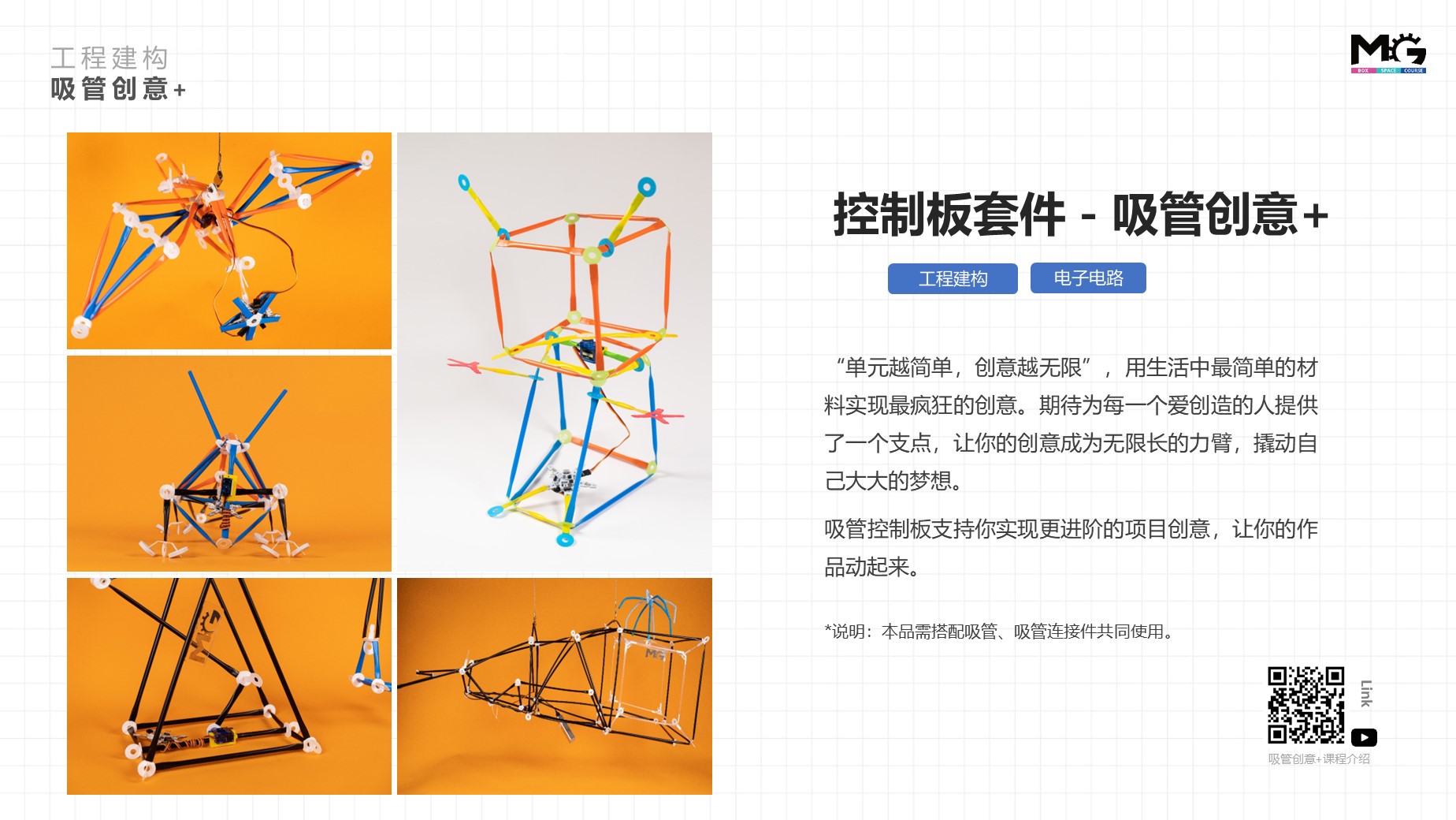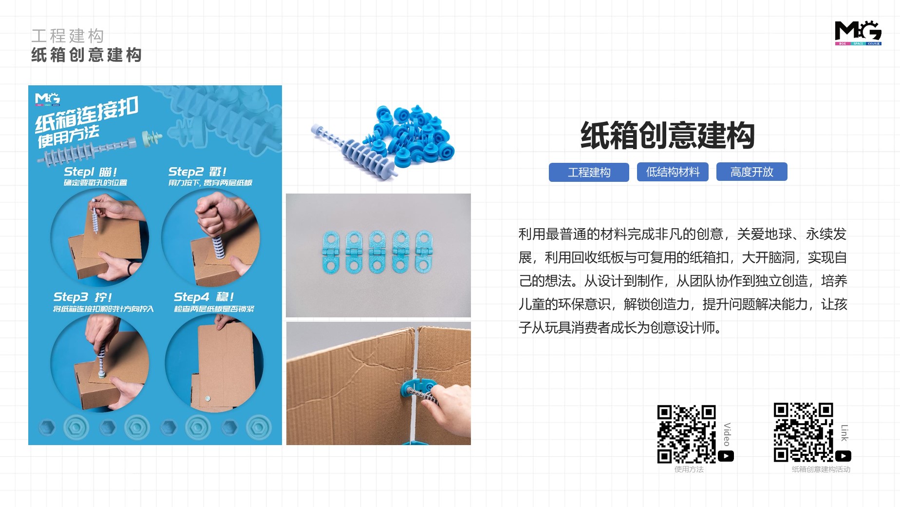 “单元越简单,创意越无限”,MG低结构建构系列利用常见的吸管、纸箱、小木块等,加上自研的电路板,支持孩子轻松实现各类创意。